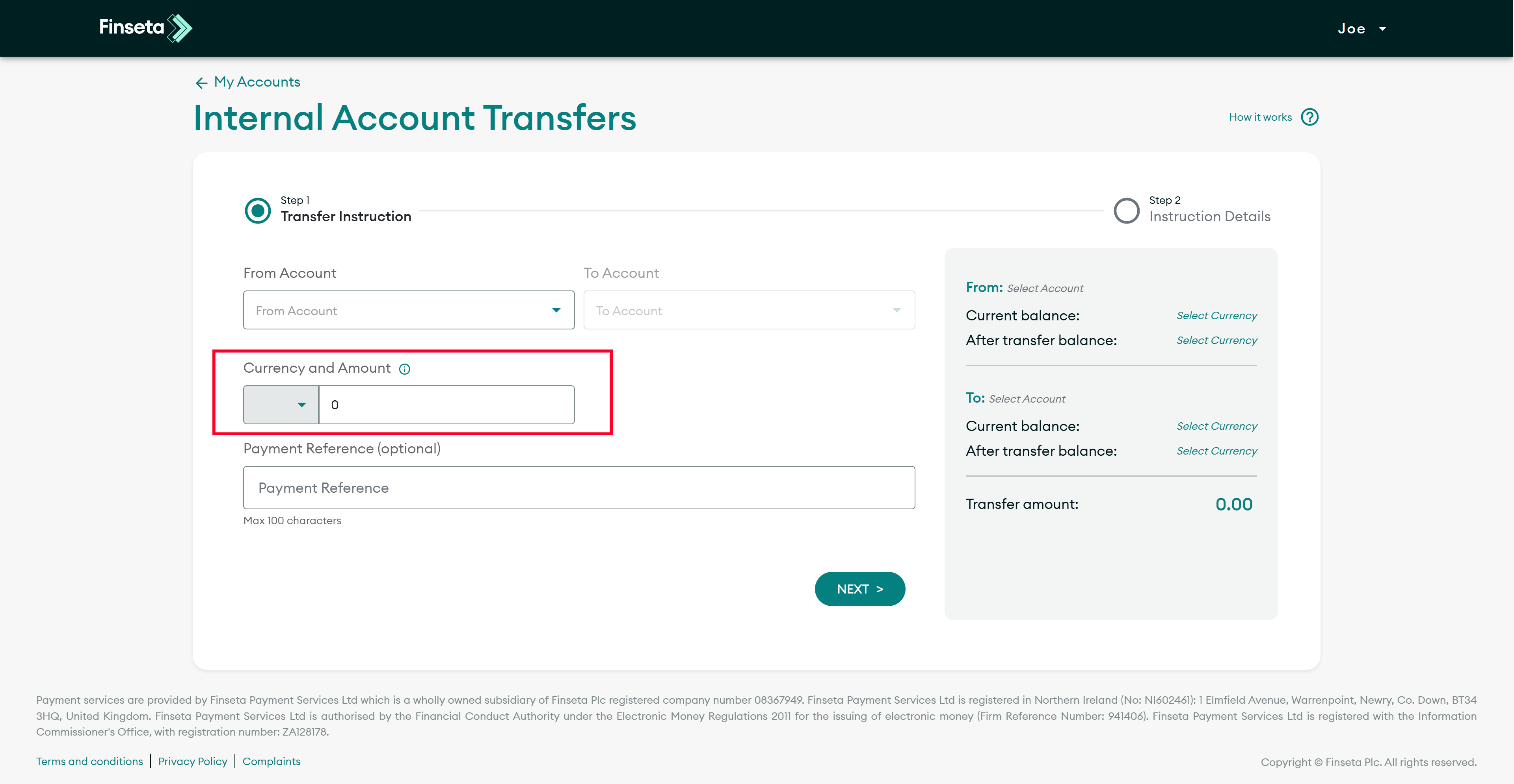 Select the currency you wish to use for the transfer, then enter the amount you wish to send.